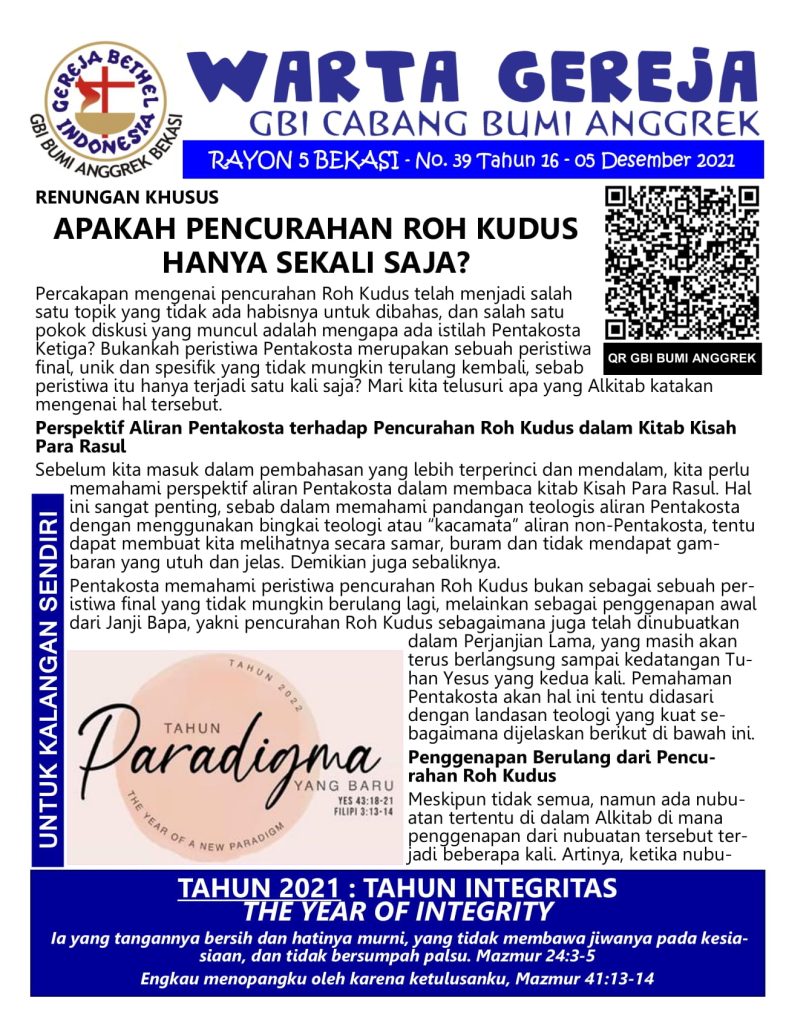 Menghidupi Pentakosta KetigaSudah Dimulai atau Akan Terjadi? Pada tahun 2013, Bapak Gembala kita telah mendeklarasikan bahwa Pentakosta Ketiga sudah dimulai. Bahkan hari-hari ini dikatakan, “Pentakosta Ketiga sedang terjadi”. Bersamaan dengan hal ini, Bapak Gembala juga mengatakan, “Kita sedang menantikan pencurahan Roh Kudus dari Pentakosta Ketiga yang dahsyat.” Bagaimana kita memahami kedua pernyataan ini? Apakah Pentakosta […]